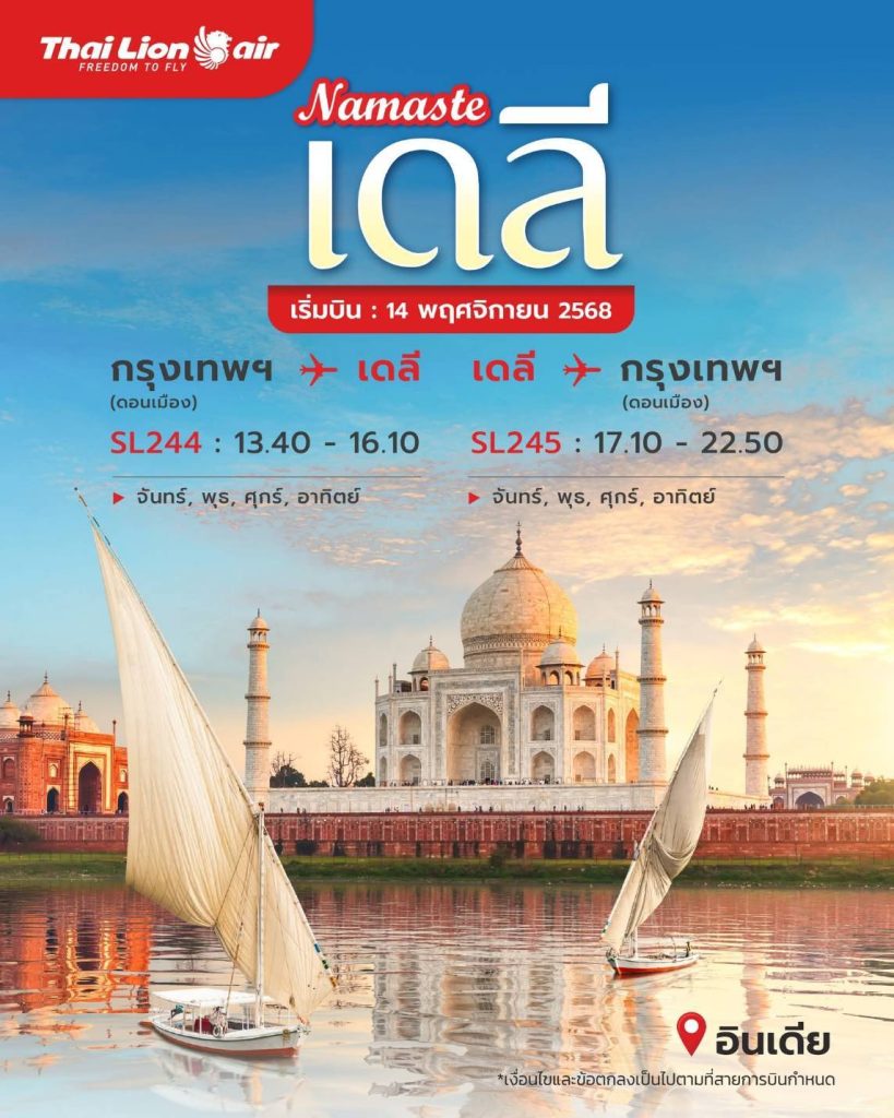 ไทยไลอ้อนแอร์ เปิดเส้นทางใหม่กรุงเทพฯ-เดลี เริ่มบิน 14 พ.ย.