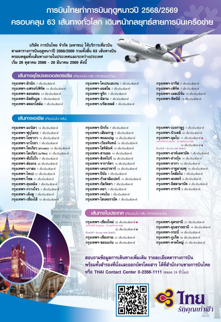 THAI ประกาศตารางบินฤดูหนาวปี 2568/2569 ครอบคลุม 63 เส้นทางทั่วโลก เดินหน้ากลยุทธ์ผนึกเครือข่าย