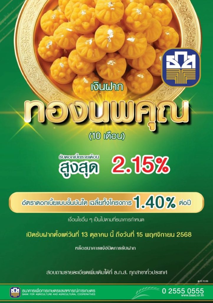 ธ.ก.ส. เปิดตัวเงินฝาก “ทองนพคุณ” รับดอกเบี้ยขั้นบันไดทุกเดือน สูงสุด 2.15% ต่อปี