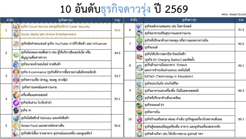 เปิด 10 ธุรกิจดาวรุ่งปี 69 Cloud-Cyber Security ยืนหนึ่ง สายมู-ความงามยังแรง โชห่วย-สิ่งพิมพ์ติดกลุ่มดาวร่วง